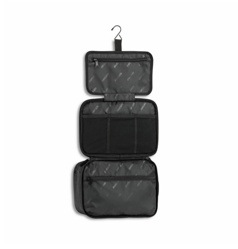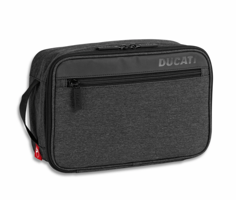 The Urban beauty-case is dedicated to Ducatisti who love traveling and trips out of town, on two wheels and more. This spacious accessory designed in collaboration with Ogio, features practical compartments and a handy hook to hang up the beauty/cosmetic case when in use, and adapt to even the most adventurous situations. The red Ducati shield label, logo-marked zip-pullers and the custom lining add even more personality to this accessory, making it a must-have for your next business or leisure trip.