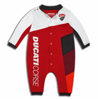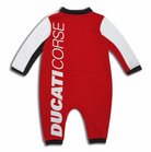 Ducati Corse baby suit made of hypoallergenic, breathable materials and non-toxic prints. The practical nickel-free buttons and the softening and anti-shrink treatments make it exceptionally functional and comfortable. The eye-catching design matches the black with the neon red and burgundy, the colors of the Moto GP 2022 livery, creating an asymmetrical racing world inspired graphics, and is further enhanced by the maxi logo and shield. An exclusive garment with a bold character, for those who are born Ducatistas.
