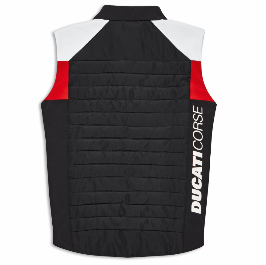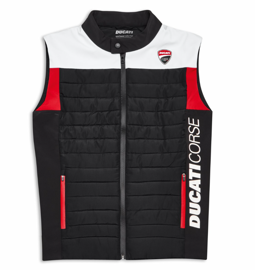 This stylish vest offers light insulation and wind protection, perfect for cooler weather. Made from 100% polyester with neoprene and 100 gsm wadding, it includes two outer pockets and one inside pocket for convenience. Customizable with patches and prints, it belongs to the Ducati Corse line and is easy to care for.