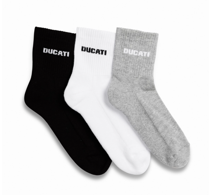 A three-pack of socks that are ideal for athletic use thanks to their excellent level of comfort and highly breathable fabric, which expels sweat without retaining it. The neutral colors and contrast logo are ideal for adding a touch of Ducati style to any sporty outfit.