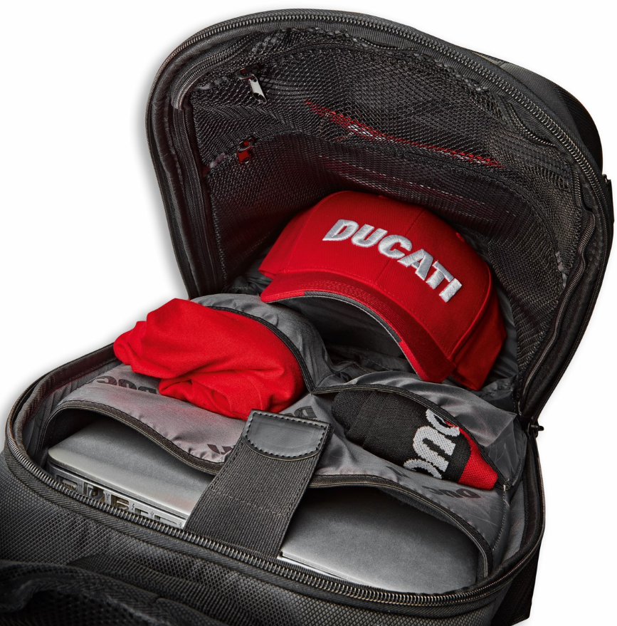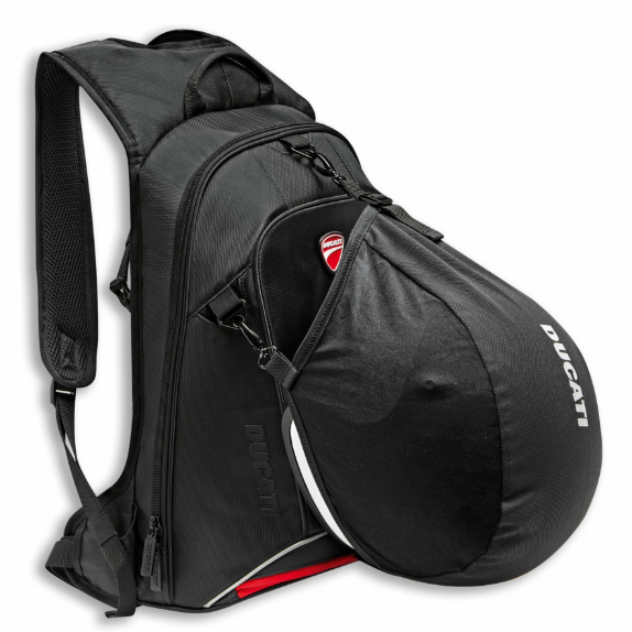 The handy Redline B4 preformed motorcycle knapsack, developed in collaboration with Ogio, won't lose its shape in the wind, while the interior is arranged to hold all materials neatly and securely. The foam on the back support profile increases ventilation, while a removable helmet bag that attaches to the knapsack with hooks is located in a special compartment at the front. Zippers eliminate vibrations, providing added safety, and ergonomic, padded, adjustable shoulder straps with quick hookups provide excellent comfort. The flat bottom allows it to stand upright and the comfortable padded compartment can accommodate most 15-inch laptops, making it suitable for more urban use as well. Ducati customizations make Redline B4 an iconic accessory with character, perfect for unleashing your Ducati passion both on and off the bike.