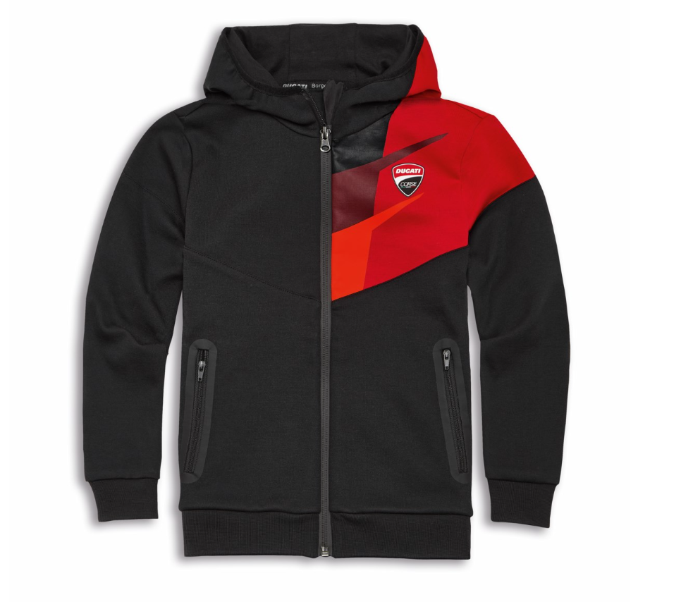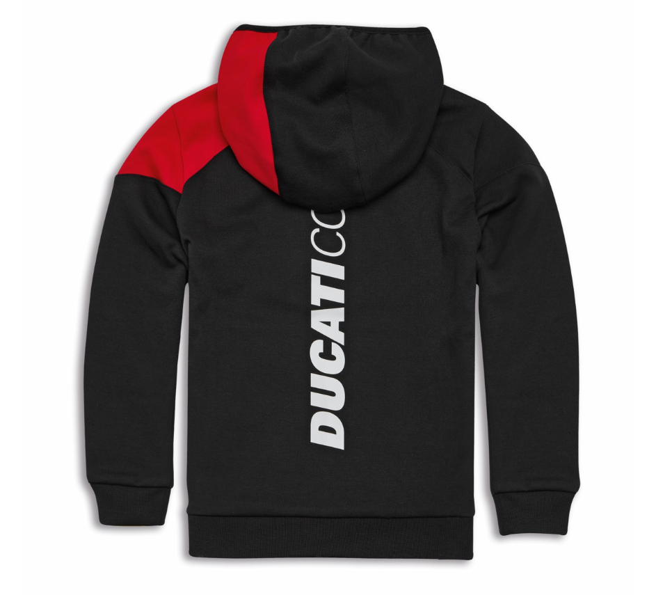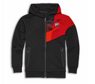 The DC Speed front zipped sweatshirt w/hood boasts eye-catching asymmetrical graphics, where different shades of red mix and blend to create the distinctive Ducati color, also used to enhance part of the hood and the back. A contrast white Iogo and shield on the left breast add an extra touch of personality to the garment, complementing its original style and adrenalin colors for a look that will definitely ensure you stand out in the crowd.