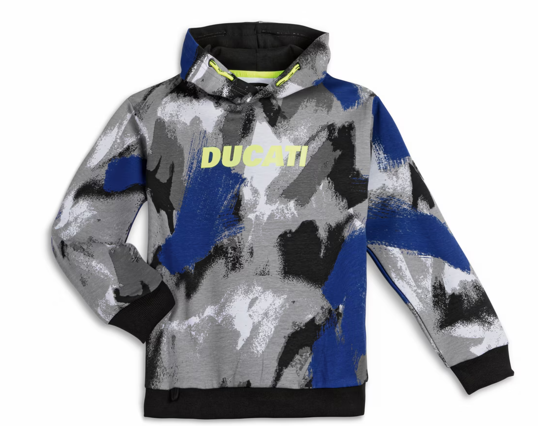 The style and quality of the Sarabanda brand intertwines with the bold look of the Reds of Borgo Panigale in this Pop 5.0 sweatshirt, a snazzy and casual design in which more classic shades of color are energized by a captivating touch of lime green that highlights the central Ducati logo and also the drawstring on the hood. A sporty yet rather quirky style that will definitely convince the younger Ducatisti.
