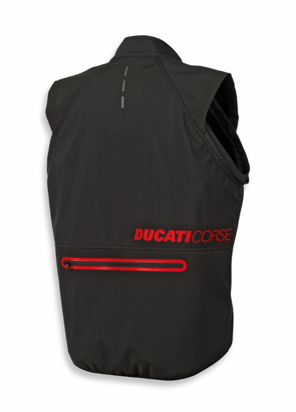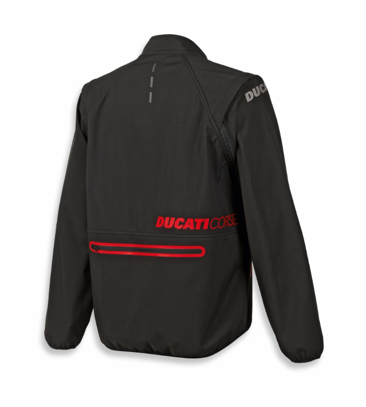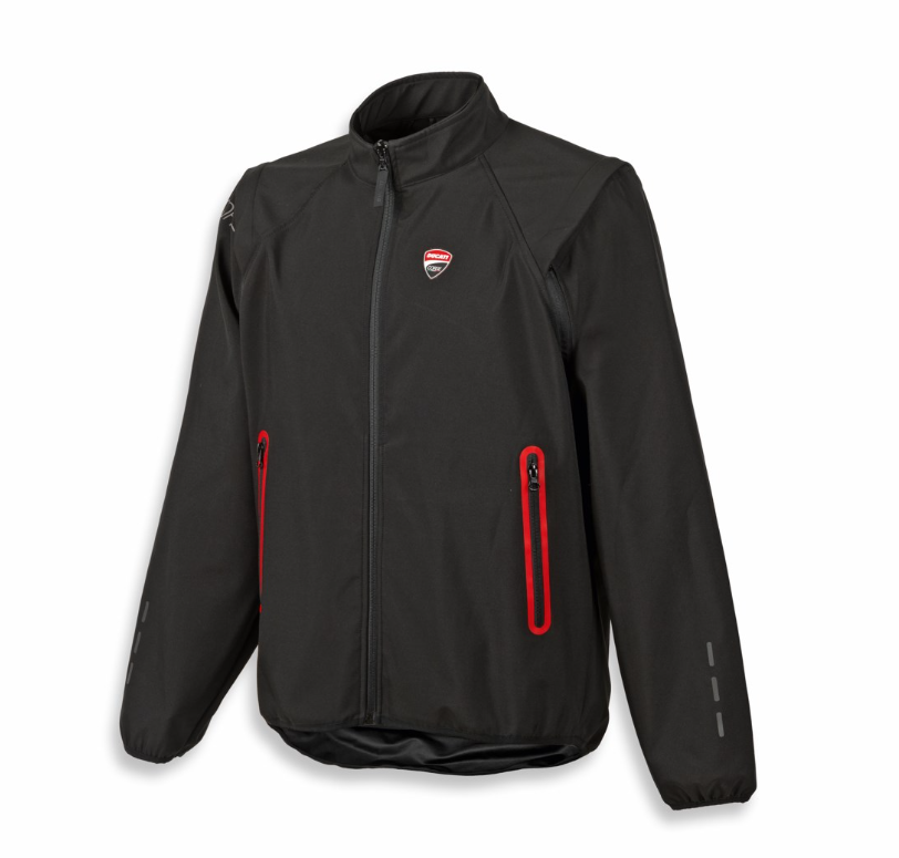 The Ducati Desmo jacket, developed in collaboration with Spidi, is a streamlined and functional garment that features high versatility. Made of elasticated soft-shell and featuring 3 layers: soft-shell fabric, windproof and breathable membrane, micro pile. Reflex prints increase visibility at night, while the removable sleeves, which can be folded into the handy big pocket on the back, make it possible to adapt to different weather conditions. Finally, the elastic at the back and cuffs ensures a good fit. The jacket's understated look, enlivened by iconic Ducati red details, makes it the perfect garment for those looking for a technical jacket to wear both on and off the bike.