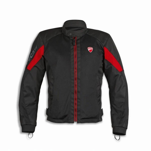 Trendy and distinctive design for this Flow C5 men's fit jacket designed by Drudi Performance specifically for summer use in countries with hot climates. The ample mesh areas allow great air flow, while the detachable H2Out® membrane has a rain-proof, breathable and windbreaker function, depending on whether you wear it on top of or under the jacket. It features a spacious rear big pocket to fold away the membrane when not in use, and a waterproof pocket to safely store your phone and important documents. The jacket offers ultimate comfort and safety thanks to shoulder and elbow protectors, the possibility to wear the back protector – to be purchased separately – and reflex prints to boost visibility. Create the perfect look when out and about with your partner with this jacket available for him and for her, practical and comfortable to wear featuring a red and black block print. A sophisticated garment for traveling or moving around in style...Ducati style of course!
